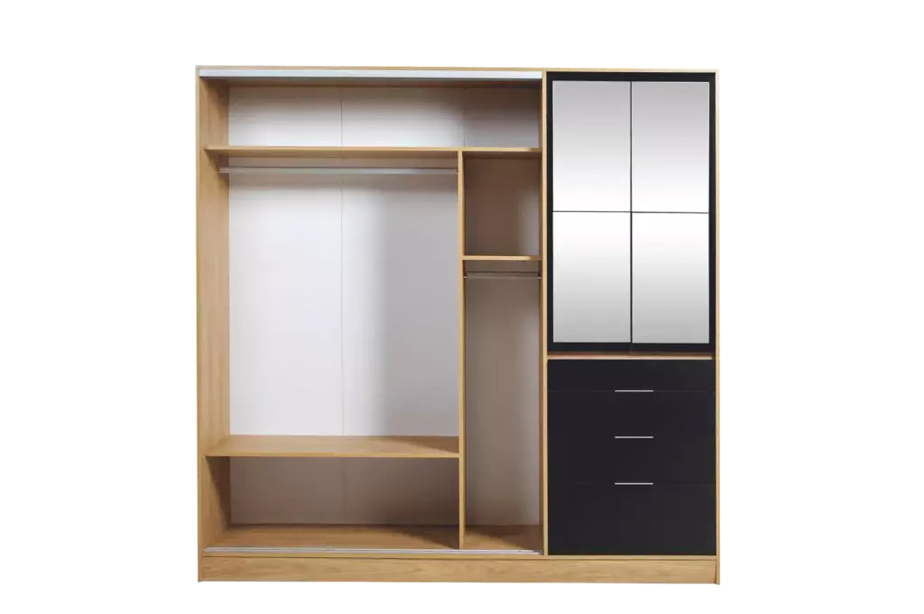 El Placard Murano Mix combina puertas corredizas y abatibles con espejo, logrando un estilo elegante y a la vez práctico. Su melamina premium texturizada de 15 mm aporta resistencia y un acabado sofisticado que realza cualquier ambiente.